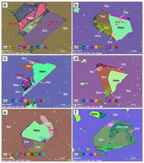 The development of polymineralic inclusions (Figure 6), in which several minerals seem to have crystallized together within the confines of a tiny enclosure, suggests an origin by incorporation of aliquots of a boundary-layer melt developed as the host mineral grew, much as we found in the fluorapatite prisms at the Yates prospect, Quebec [30]. Such a melt contained all constituents rejected by the rapidly growing host, either forsterite or spinel. This enrichment explains how the melt inclusion crystallized to an intergrown assemblage of a sulfate (anhydrite), a phosphate (apatite), a silicate (quartz, phlogopite), along with the carbonates (Figure 6). The carbonate component consists of calcite (dominant) and dolomite, but in some instances, magnesite is present (e.g., Figure 6c, Atlas 5 BBV datasets). This may indicate that in the time available, the melt had not become well blended.