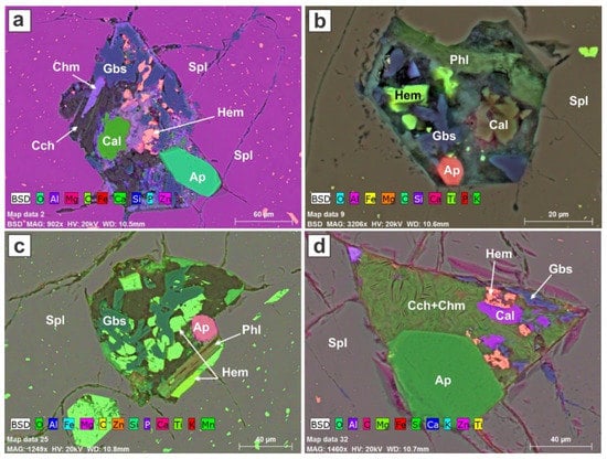 The inclusions in Figure 9 are relatively pristine. Other than the hematite flakes, the minerals seem to have crystallized from a single melt within the confines of the globule’s volume, which in some cases has a morphology controlled by the spinel host (Figure 9a,d). One gets the impression that the hematite nucleated independently in the melt, and continued to grow once trapped in the spinel by late dissolution of specks of hematite within radius of 10 μm from the included clusters. Figure 9b,d contain a silicocarbonate assemblage: calcite–dolomite–anhydrite–phlogopite–ilmenite and calcite–dolomite–anhydrite–phlogopite–apatite. Figure 9a is devoid of a silicate. Recall that these images illustrate random cuts in three-dimensional objects; we are thus not sampling the minerals in their correct volumetric proportions.