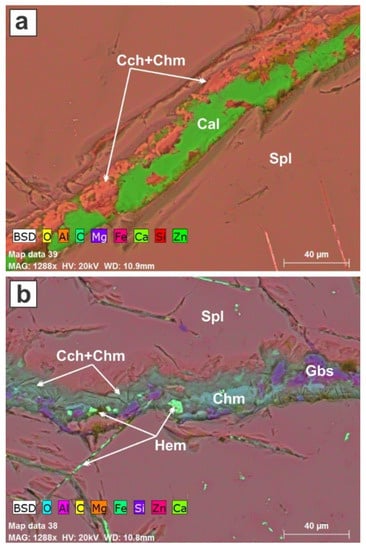 False-color EDS element-distribution maps of minerals deposited along fractures in the large single crystal of spinel. (a,b) The fracture is filled with clinochlore, chamosite, calcite, hematite, and gibbsite (or one of the other polymorphs of Al(OH)3).