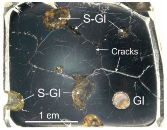Example of a polished fragment of Elga IIE iron meteorite. S-GL—silicate + glass inclusions, Gl—felsic glass inclusion.
