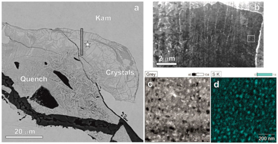 Crystal-like FN3 aggregate with average composition (Fe2.45Ni0.52Co0.02)2.99(P0.73S0.28)1.01 (a) coexisting with quenched oxidized FN3 aggregates (Site 13 in Table S1). Star shows position of EBSD pattern. Bar shows location of focused ion beam film presented in (b). (c) and (d) secondary electron image and elemental map for sulfur in the area shown by square in (b). (b–d) are based on our preliminary transmission electron microscope data.