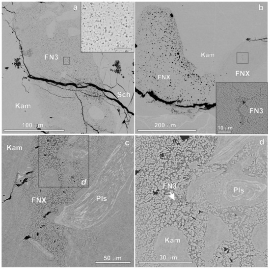 FN3 appears as a micro- or nanocrystalline mixture of two or three phases at the boundary between schreibersite and troilite, where melt pockets could form zoned patterns with FN2 near troilite, intermediate compositions between FN2 and FN3 (Figure 2 and Table S2), and FN3 aggregates partially contaminated by metal. In the latter, FN3 is represented by cryptocrystalline zones surrounded by FNX (Figure 3 and Table S1).