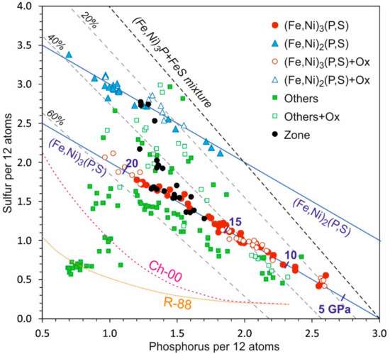 Phosphorus vs, sulfur contents in (Fe,Ni)3(P,S) melt pockets from Elga meteorite. Ox–partially oxidized melt pockets. Others correspond to intermediate non-stoichiometric FNX compositions. “Zone” shows the compositional variation of Fe–Ni–P–S alloy from schreibersite to troilite (see Figure 2 and Table S2). Pressure values in GPa correspond to maximum S solubility in Fe3P1-xSx alloys [20]. Black dashed line shows compositions of mechanical mixture between schreibersite and troilite. Grey dashed lines are same with an addition of 20, 40, and 60 mol.% of (Fe,Ni)-metal. Dotted lines show the limit of liquid immiscibility in the Fe–P–S system after Raghavan [25] (R-88) and Chabot and Drake [26] (Ch-00).