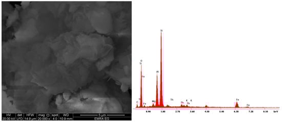 The surface morphology and microstructure of Na-bentonite, HQ-bentonite, and U(VI) and Th(IV) ions loaded HQ-bentonite are shown in Figure 2, Figure 3 and Figure 4. Results indicated that the surface morphology of Na-bentonite is relatively smoother, and reveals a more spongy appearance with irregular structure than HQ-bentonite. After modification, HQ-bentonite surfaces became swollen and accompanied by a small number of holes. This swelling indicated that 8-hydroxyquinoline intercalated into the inner layers of Na-bentonite. To compare the altering of surface morphology and trace the elemental changes after the adsorption, SEM and EDX micrographs of U(VI) and Th(IV) ions loaded HQ-bentonite (Figure 3 and Figure 4) were measured. After loading with U(VI) and Th(IV) ions, the HQ-bentonite structure was covered with the encaged ions. This provided complementary evidence for the adsorption process.