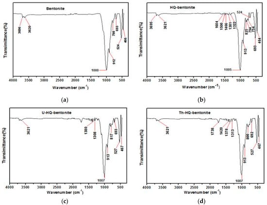 Figure 5a–d demonstrates the FT-IR spectra of Na-bentonite, HQ-bentonite, and U(VI) and Th(IV) ions loaded HQ-bentonite, respectively. The figure gives information on the intercalation of the 8-hydroxyquinoline onto the Na-bentonite and the interaction nature of HQ-bentonite with metal ions. Na-bentonite shows (Figure 5a) an absorption peak at 3620 cm−1 which is attributed to (O–H) stretching vibration of the silanol (Si–OH) group. The strong band at 1000 cm−1 is due to the (Si–O–Si) groups of the tetrahedral sheet. The deep peak at 912 cm−1 shows the stretching vibration of (Al–Al–OH). The band at 798 cm−1 is attributed to quartz in the sample. The stretching vibration band at 693 cm−1 is ascribed to the deformation and bending modes of the Si–O bond. The bands at 466 and 524 cm−1 are attributed to (Si–O–Si) and (Al–O–Si) bending vibrations, respectively. The (C–C) and (C–N) ring stretching (skeletal) vibrations in the HQ-bentonite (Figure 5b) are located at 1604, 1500, 1466, 1381, and 1322 cm−1 and the ring bending vibration are obtained at 825 cm−1 but these bands were not observed in the Na-bentonite [12]. This gives acceptable proof for the intercalation of 8-hydroxyquinoline onto Na-bentonite. As shown in Figure 5c,d after the adsorption of U(VI) and Th(IV) onto HQ-bentonite, the observed shifts were as follow: the (O–H)stretching vibration of the silanol (Si–OH) group was shifted to 3621 cm−1, the (Si–O–Si) band of the tetrahedral sheet was shifted to 1007 cm−1 and the stretching vibration of (Al–Al–OH) was shifted to 913 cm−1, for both metal ions. The C–C and C–N ring stretching bands were moved to 1380 and 1308 cm−1 for U(VI) and 1738, 1420, 1378, and 1313 cm−1 for Th(IV), whereas, the ring bending vibration was shifted to 817 cm−1 for U(VI) and 800 cm−1 for Th(IV). The deformation and bending bands of the Si–O bond were shifted to 693 and 692 cm−1 for U(VI) and Th(IV), respectively. The bending vibrations band of Si–O–Si was moved to 467 cm−1, whereas, the Al–O–Si was shifted to 527 cm−1, for both metal ions. These peak shifts indicate the interaction between the metal ions and HQ-bentonite.