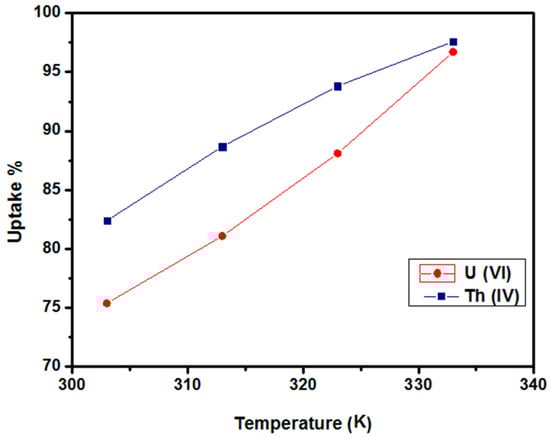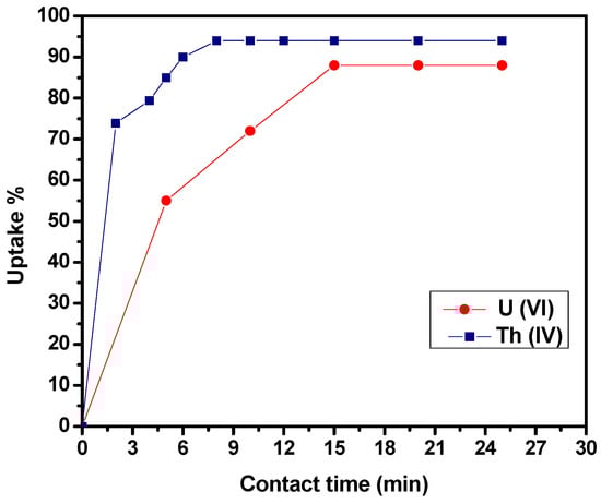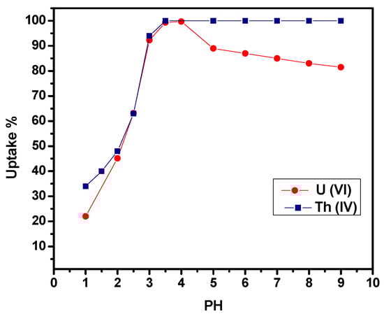 It should be mentioned that the species distribution in solution for both metal ions varies by varying the pH values. At pH values less than 3, UO22+ ions exist as the predominant species [24]. At pH 4, hydrolysis of the uranyl ions commences; where mononuclear [UO2(OH)]+ as well as polynuclear species such as [(UO2)2(OH)2]2+ and [(UO2)3(OH)5]+ are formed. The little adsorptive affinity of these species accounts for the decrease in U(VI) removal efficiency at pH values above 4 [25,26]. Similarly, Th(IV) speciation varies by altering the pH values. At pH values less than 3, Th4+ ions exist as the major species. At pH values beyond 4, the hydrolysis products as well as the precipitation begin to play a role in the adsorption of Th(IV) [27,28]; so, the uptake percentage maintains constancy with increasing pH above 4.0. To avoid precipitation, a solution pH of 3 and 4 for Th(IV) and U(VI) was used for further experiments [3].