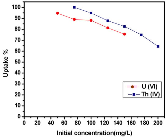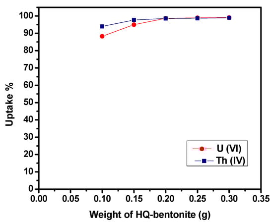 The influence of the initial concentration of U(VI) and Th(IV) on uptake percentage of HQ-bentonite is shown in Figure 8. The results showed a decrease in the uptake percentage by increasing the initial concentration of metal ions. The poor adsorption capacity at high metal ion concentrations is attributed to the increased ratio of sorption quantity of U(VI) and Th(IV) ions on the HQ-bentonite surface to available vacant sites.