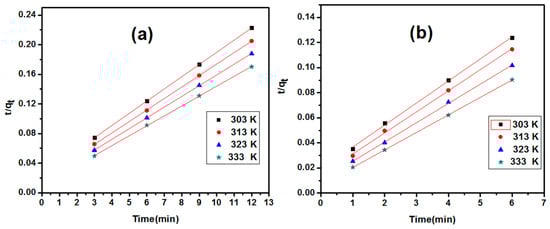 where qe and qt (mg/g) are the amount of metal ion adsorbed at equilibrium and time t, respectively, and k1 and k2 are the equilibrium rate constant (min−1) of the pseudo-first-order and pseudo-second-order adsorption, respectively. Using Equation (8), the linear form of log (qe − qt) versus t was plotted. Figure 12 shows the linear plot of t/qt versus t using Equation (9).