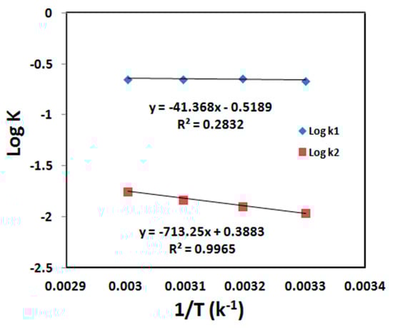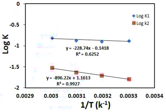 Table 3 shows the calculated values of k, qe, Ea, and correlation coefficient (R2) of the pseudo-first- and pseudo-second-order models for U(VI) and Th(IV) ions sorption on HQ-bentonite. The results reveal that the pseudo-second-order kinetic model fits the data for the sorption process since the values of the correlation coefficient (R2) of pseudo-second-order were higher than the value of the pseudo-first-order model. The natural logarithms of the rate constant (K) were used according to the Arrhenius equation to calculate the activation energy of the sorption process. A plot of log k versus 1/t gives a straight line as shown in Figure 13 and Figure 14. The activation energy for pseudo-first-order and pseudo-second-order can be calculated from the slope of the line since the slope is equal to (). The calculated values of activation energy of U(VI) and Th(IV) onto HQ-bentonite were found as 13.7 and 17 kJ/mol for uranium and thorium, respectively (Table 3), which are within the activation energy range 0–40 kJ/mol, indicating that the adsorption of U(VI) and Th(IV) onto HQ-bentonite is a physical one [30,32].