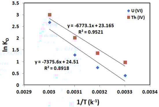 Variation of ln KD with 1/T for sorption of U(VI) and Th(IV) onto HQ-bentonite.