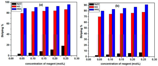 Effect of NaCl, HCl, and HNO3 on stripping percentage of (a) U(VI) and (b) Th(IV) from HQ-bentonite.