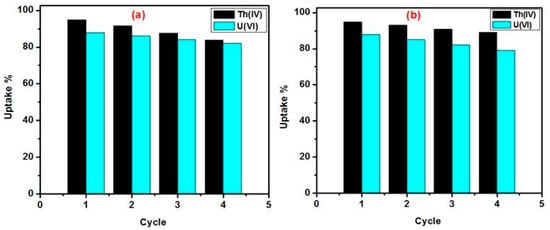 Recycling of U(VI) and Th(IV) loaded HQ-bentonite using (a) 0.25 M HCl and (b) 0.25 M HNO3. Sorption conditions: 0.1 g HQ-bentonite; 100 mg/L metal ion; 50 mL solution; U(VI) (pH 4), Th(IV) (pH 3); shaking time U(IV) (15 min.), Th(IV) (8 min.); 303 K.