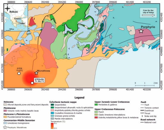- Vakalopoulos, P.; Efthimiopoulos, T.; Arvanitis, A.; Xenakis, M.; Vougioukalakis, G.; Galamakis, D.; Gkagka, M.; Lachana, G.; Kanellopoulos, C.; Fragkogiannis, G.; et al. Geothermal exploration in Eastern Thessaly. I.G.M.E., NSRF (National Strategic Reference Framework) 2007–2013/Operational Programme “Competitiveness and Entrepreneurship”/Project “Geothermal energy exploration in selected areas, in order to reduce energy dependency and environmental impact. Assessment of hot groundwater and geothermal resources (GEOTHEN)”. Athens, Greece, 2016; p. 238. Available online: http://igme.gr/index.php/proionta-ypiresies/23-erga/erga-espa-2007-2013 (accessed on 15 May 2016).