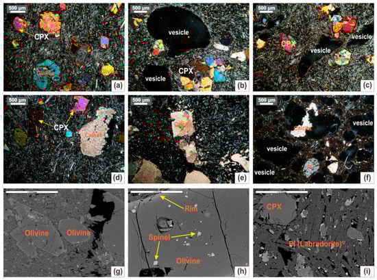 (a) Olivine and clinopyroxene phenocrystals in a hypo-crystalline trachytic groundmass mostly consisting of lath-shaped plagioclase but also K-felspar (Sample M3). (b,c) Vesicular basaltic lava samples M1 and M8, mainly consisting of clinopyroxene and also olivine phenocrystals, exhibiting glomeroporphyritic textures. It includes a hypo-crystalline trachytic groundmass, as well as vesicular textures. (d) Vesicular basaltic lava sample M2, with clinopyroxene and olivine phenocrystals in a trachytic groundmass. Vesicles are occasionally filled with secondary calcite-forming amygdaloidal textures. (e) Vesicular basaltic lava sample M5, within a microcrystalline vesicular groundmass, filled with secondary calcite. (f) Pyroclastic tuff with a high percentage of vesicles. Groundmass locally aphanitic with rare feldspar phenocrysts. (g–i) BSE (Back Scattered Electron) images with olivine and clinopyroxene phenocrysts.