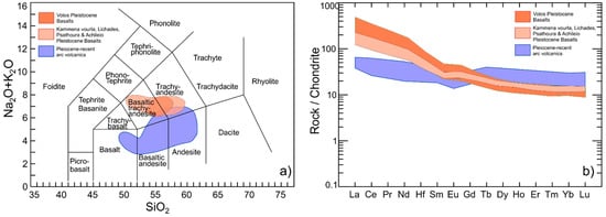 Volcanic rocks from the region of Volos correspond to small scattered outcrops with an age range from 0.5 to 3.4 Ma [21,29]. Their formation was attributed to Pleistocene back-arc extension in the Aegean Sea [19,30,31]. Based upon the total alkali–silica (TAS) diagram (Figure 3a), the extensional-related volcanic rocks from the Volos plot formed within the basaltic trachyandesite and trachyandesite fields. Pleistocene basalts from the adjacent regions of Kamena Vourla, Lichades islands, Psathoura, and Achilleio also plot in the same compositional fields (Figure 3a). Chondrite-normalised REE patterns of the Volos basaltic rocks (Figure 3b) are highly enriched in LREE (La/YbCN = 0.34–0.44) and also present notable negative Eu anomalies (EuCN/Eu* = 0.73–0.80), with the later implying plagioclase fractionation. These are additionally characterised from trace element ratios that account for a clear OIB (Ocean Island Basalt)-signature: Zr/Nb = 4.66–19.82, La/Nb = 0.75–10.38, and Ba/Th = 39.4–100.95 [32]. Basalts from the aforementioned adjacent regions exhibit lower LREE enrichments (Figure 3b), indicating higher degrees of partial melting and/or differentiation processes.