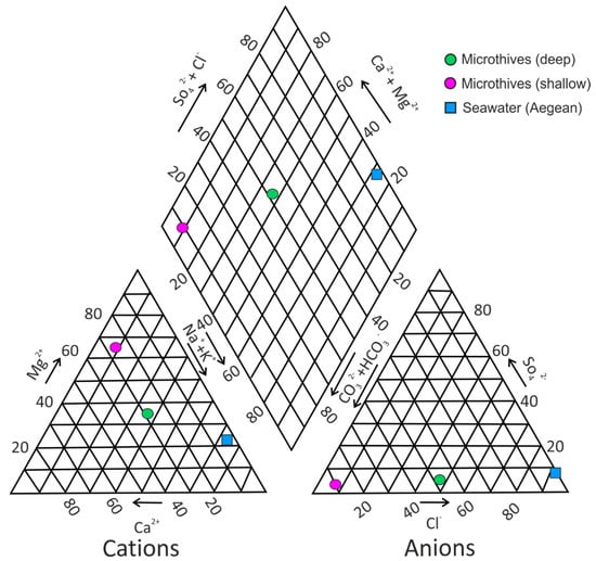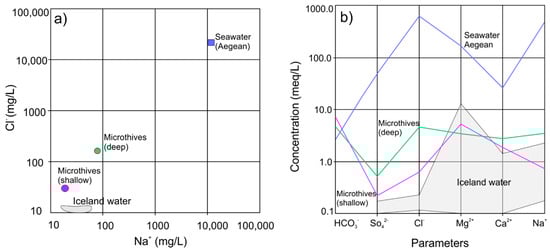(a) Ludwig–Langelier [74] diagram for the water sample of Microthives and the seawater sample from the Aegean Sea. (b) Schoeller diagram [75] for the Microthives water sample and the Aegean seawater [28,51].