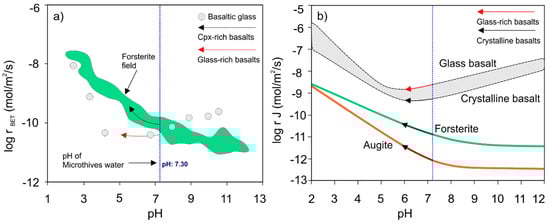(a) Modified diagram of the dissolution rate of the forsterite (T: 25 °C; [64]) and basaltic glass (T: 30 °C) [65] vs. pH. The dissolution rate is normalised to the BET surface area of the dissolving mineral and glass grains. (b) Modified diagram [68] of the dissolution fluxes (mol m−2 s−1) at T: 25 °C of crystalline and glassy basalts. Forsterite and augite dissolution rates taken from [63].