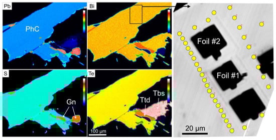 EPMA element maps (Pb, Bi, S and Te) of the selected lamella and location of EPMA spot analysis data and FIB cuts (box on Bi map). The BSE image on the right shows the location of foils #1 and #2 and the points (yellow circles) from which EPMA spot data in Table 2 and Figure 1 were taken. Gn—galena; PhC—“Phase C”; Tbs—tellurobismuthite; Ttd—tetradymite.