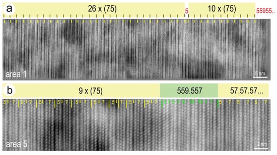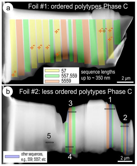 The orientation of the lamella is close to the zone axis, allowing identification of the polytypes and further details of their distribution across foil #1 (Figure 4). The longest intervals of (57) repeats are surrounded by disordered stacking sequences interspersed with (557.559) and (5559) sequences of variable lengths, from ~100 nm to ~200 nm (Figure 4a).