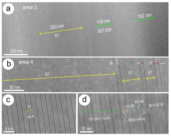 The boundary of the longest (57) sequences dissipates into shorter (57) intervals interspersed with stacks comprising longer layers of 9- and 11-atoms (Figure 4b). In detail, the ordered and disordered polytypes sequences are recognisable by the presence of 7- and 9-atom layers that are readily identifiable on the HAADF STEM images (Figure 4c,d). The width of the layer stacks for the three polytypes representing the composition of “Phase C” vary from ~24 Å, to ~48 Å and ~72 Å for (57), (5559) and (557.559), respectively (Table 3). Therefore, up to 145, 16 and 40 repeats of the (57), (557.559), and (5559) polytypes, respectively, are present throughout the intervals marked as area 3 in foil #1 (Figure 4a). However, the two longer polytypes, (557.559), and (5559), could also form up to 48 and 72 repeats within any given interval of ~350 nm imaged in foil #1 (Figure 3a).