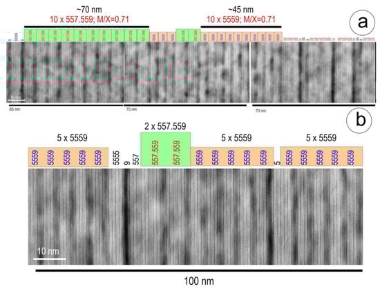 Examples of stacking sequences imaged from foil #2 show far greater changes in the periodicity of (557.559) and (5559) polytypes over tens rather than hundreds of nm (Figure 6). The intervals outside the two polytypes are dominated by presence of (557) stacks interspersed with 9-atom layers (Figure 6a), or (55559.557) stacks (Figure 6b). Such stacks have ε < 0.14 (Table 3) typical of “Phase C” and would account for compositional variation towards the chalcogen-rich side of the cluster shown on Figure 1. Intervals of ~200 nm in length imaged and mapped from four areas show a good correlation between the stacking sequences and the distributions of Bi, Te, Pb and S (Figure 7 and Figure 8).