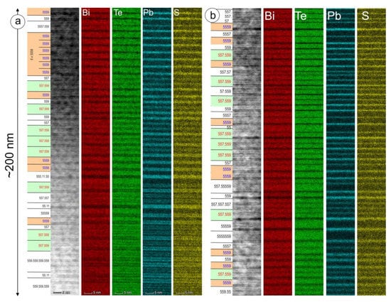 Extended STEM EDS maps (Bi, Te, Pb and S) indexed by layers over lengths of ~200 nm in area 3 (a) and area 4 (b) from foil #2. Note, positive correlations between Bi and Te, and between Pb and S. Colour code as in Figure 3. Note 10 x regular repeats of (557.559) polytype, dominant throughout foil #2.