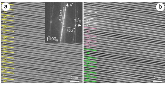 Measurements on FFTs patterns for the three polytypes (Table 4) give a range of calculated dN values and N integer numbers which correspond to the number of atoms across the stacking sequence, as seen on the high-resolution images (Figure 10a–c). The range of values for γF obtained from the measured d and qF values using formulae resulting from Equation (1) are close to those calculated from basic principles (Table 3). The best fit for the obtained values can be considered for γF = 0.1664 for all three polytypes. The c parameter calculated from measured values is close to theoretical values at the best fit condition in each case (Table 4). We note that the (57) polytype has two solutions for the same γF value of 0.1664. Of these, the value c = 23.2 Å is very similar to c = 23.12 Å obtained for the synthetic analogue of Phase C (Table 1; [18]). Measurements for da from FFTs on the zone axis are within the range 3.7–3.5 Å, giving parameters for a between 4.27 Å and 4.5 Å when using the formula: a = da/cos30°. The smaller value is close to a = 4.24 Å obtained for the synthetic analogue of Phase C (Table 1; [18]).
