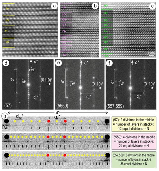 (a–c) High-resolution HAADF STEM images of the (57), (5559) and (557.559) polytypes, respectively, on zone axis. (d–f) Fast Fourier Transform (FFT) patterns of each of the three polytypes showing d* and qF* intervals with measurements listed in Table 4. (g) Details of d*~2 A intervals showing the three polytypes are N superstructures of a d*subcell. Explanations to the right side. Whereas the number of equal divisions defined by the satellite reflections (yellow spots) and their intensity variation across d* are not well-defined, the number of divisions (i) within the middle part of d* (between the brightest two reflections; red spots) corresponding to the modulation vector qF* are visible on the FFT patterns. The distances between two satellite reflections is dN (example d12) and represent the c parameter for phases with hexagonal symmetry.