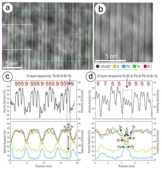The correspondence between the measured and predicted values using the displacement vector model for interface modulated structures following the approach in [3] confirms that the aleksite series is part of the broader class of mixed-layer compounds. This proves that the crystal chemical modularity of the series depends upon the widths of the component modules and their stacks [3] rather than chemically defined units defined in terms of mPbS.nBi2Te2S (Table 1). The identity of each atom within a given layer unit can be seen across profiles obtained from the EDS STEM map 1 (Figure 11). The HAADF signal depicts the number of bright atoms within each layer, i.e., two, three, or four, in the five-, seven- and nine-atom layers, respectively, and the sequence can be directly compared with the images (Figure 11a–d).