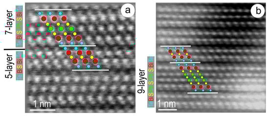 The longest (nine-atom) layer observed in the sequence depicted in Figure 11 shows how the signals for Bi, Te, Pb and S map the atomic arrangement within the layer (Figure 11d). This shows that the HAADF signal is reduced in the middle of the nine-atom layer (Figure 11c,d) because the Pb and S atoms are always positioned in the middle of the sequence. This also explains why the brightness of the layers decreases with an increase in the total number of atoms in a given layer on the extended maps (Figure 6, Figure 7 and Figure 8). For example, the five-layers (Te–Bi–S–Bi–Te) are the brightest, followed by the seven-atom layers (Te–Bi–S–Pb–S–Bi–Te), but these are still less dark than the nine-atom (Te–Bi–S–Pb–S–Pb–S–Bi–Te) or 11-atom (Te–Bi–S–Pb–S–Pb–S–Pb–S–Bi–Te) layers. The atomic layers are also shown as overlays on high-resolution HAADF STEM images comprising the layer types identified in the stacks for the three polytypes (Figure 12).
