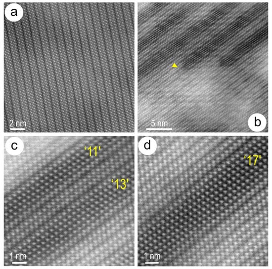 - Amelinckx, S.; Van Tendeloo, G.; Van Dyck, D.; Van Landuyt, J. The study of modulated structures, mixed layer polytypes and 1-D quasi-crystals by means of electron microscopy and electron diffraction. Phase Transit. 1989, 16, 3–40. [Google Scholar] [CrossRef]