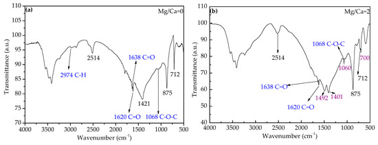 The bands 712, 875, 1421, and 2514 cm−1 of minerals at the Mg/Ca ratio 0 indicate the presence of calcite (Figure 6a); at Mg/Ca = 2, besides the bands 712, 875, and 2514 cm−1 of calcite (Mg-rich), there are the bands 700, 1060, 1401, and 1492 cm−1 of monohydrocalcite; 712 cm−1 and 1492 cm−1 also belong to aragonite (Figure 6b). At Mg/Ca = 5, besides the characteristic bands of monohydrocalcite (700, 766, 872, and 1492 cm−1), the bands 710 cm−1 and 1082 cm−1 prove the formation of aragonite (Figure 6c). 592, 796, and 1426 cm−1 indicate the presence of hydromagnesite (Figure 6c). At Mg/Ca = 7 and 9, the characteristic bands prove that the minerals are monohydrocalcite (700, 766, 872, 1492 cm−1) and hydromagnesite (592, 796, 1426 cm−1) (Figure 6d,e). The mineral phases obtained by FTIR are consistent with the results of XRD. Moreover, besides these characteristic bands of minerals, organic functional groups are also found to be present in/on the minerals, including C=O (1620 cm−1, 1638 cm−1) [36,65] and C–O–C (1068 cm−1) [66] (Figure 6a–e).
