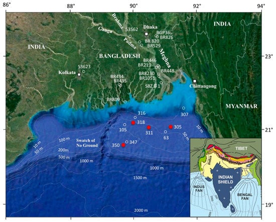 Ganga–Brahmaputra sediments reaching Bangladesh appear to be subequally partitioned among the delta plain, the prograding subaqueous delta, and the deep-sea fan []. The subaerial and submarine delta combined cover 138,000 km2, with total annual water and sediment fluxes from the Meghna estuary being around 970 km3 and 1.7 × 106 t, respectively [,]. Most of the water and nearly all of the sediment are delivered during the summer monsoon season. Suspended load consists of fine to medium silt entrained close to the surface of the channel, passing to coarse and very coarse sandy silt at depth and to silty sand close to the channel bottom. Bedload is typically fine-grained well-sorted sand, and clay does not represent more than ~10%, even in surface load [,].