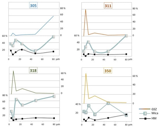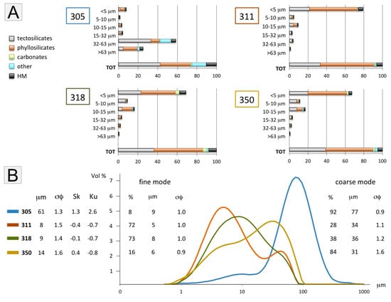 The adopted multiple-window approach allows us to investigate in detail how different minerals are distributed among the different grain-size classes of each sample (intra-sample variability) as a function of their density and shape [,]. Although inter-sample variability is relatively minor (i.e., the four studied samples show rather homogeneous bulk mineralogy), intra-sample variability is notable. Platy micas tend to concentrate in the coarse tail of the size distribution because of their low settling velocity. Clay minerals are the main component of the <5-μm class because of their fine crystal size.