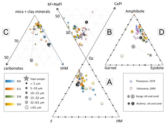 Triangular diagrams illustrating the mineralogical composition of the four studied samples, and of the six size-windows analyzed for each sample by combining grain counting under the microscope and Raman spectroscopy for classes >5 μm and XRD data for the <5-μm class. (A) Qz = quartz; F = total feldspars; HM = total heavy minerals; (B) KF + NaPl = alkali feldspars (including K-feldspar, albite, and ternary feldspars); CaPl = calcium-bearing plagioclase; (C) tHM = transparent heavy minerals; (D) relative abundance of the three most common groups of transparent heavy minerals in orogenic sediments. The average composition of Ganga (g = silt; G = sand) and Brahmaputra (b = silt; B = sand) sediments (from Garzanti et al. []), as well as mineralogical data on Bengal Fan sediments from Thompson [] and Yokoyama et al. [], are given for comparison.