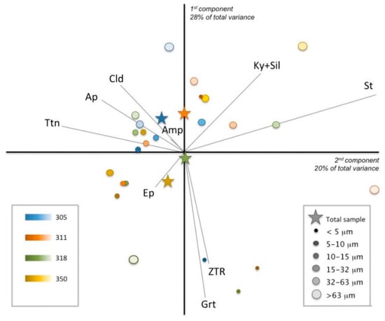 Inter-sample and intra-sample variability in transparent-heavy-mineral suites. The biplot [] drawn using CoDaPack software by Comas-Cufí and Thió-Henestrosa []) displays multivariate observations (points) and variables (rays). The length of each ray is proportional to the variance of each element in the dataset. If the angle between two rays is close to 0°, 90°, and 180°, then the corresponding compositional parameters are directly correlated, uncorrelated, and inversely correlated, respectively. Ap = apatite; Cld = chloritoid; Ep = epidote; Grt = garnet; Ky+Sil = kyanite + sillimanite; St = staurolite; Ttn = titanite; ZTR = zircon + tourmaline + rutile.