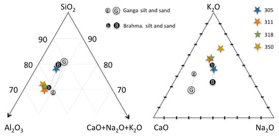In this section, we draw inferences concerning the relative contributions from the Ganga and Brahmaputra Rivers to silt and clay deposited on the Bengal shelf. Provenance of mud in the subaerial tidal delta plain and subaqueous delta was investigated by Flood et al. [] based on XRD mineralogy and XRF geochemistry, whereas Lupker et al. [] and Goodbred et al. [] used Sr and Nd isotopes, Sr concentrations, and major elements as provenance tracers. Grain-by-grain mineralogical analysis of fine silt poses diverse technical problems (e.g., difficult distinction of color and pleochroism under the optical microscope, weak Raman signal), which prevented us from achieving the same accuracy and precision obtained for sand. Moreover, sediment composition is controlled by several different factors including—in addition to provenance—grain size, hydraulic sorting, and chemical weathering.