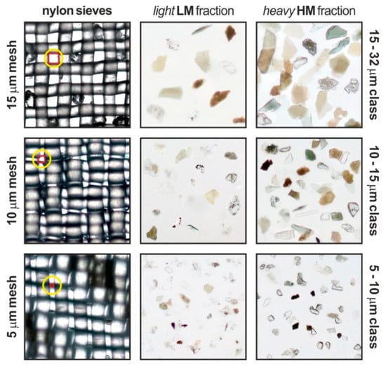 Although wet sieving at 5-μm, 10-μm, and 15-μm mesh resulted to be challenging and time-consuming, the results were rewarding (Figure 2). The quality of the grain-size separation was systematically checked for both “light” (LM) and “heavy” (HM) mineral fractions under an optical microscope provided with a scale bar. Subsequently, every slide of the LM fraction (representing between 81% and 99% of each grain-size class) was mapped using a micro-camera also provided with a scale bar. Whereas no significant misfit was detected for samples 305 and 311, we did observe a few oversized grains—mainly phyllosilicates—in each class of samples 318 and 350. In order to minimize the error, we chose not to consider oversized grains during mineralogical analysis. As far as grain-size analysis is concerned, a more serious problem is associated with the inevitable loss of material in each passage, total loss being limited to 4% overall for very coarse silt (sample 305) but reaching between 9% and 15% for fine silt (samples 311, 318, and 350; Table S2, Supplementary Materials). After sieving, each net was scrutinized under the optical microscope to check the uniformity and potential deformation of mesh size (Figure 9).