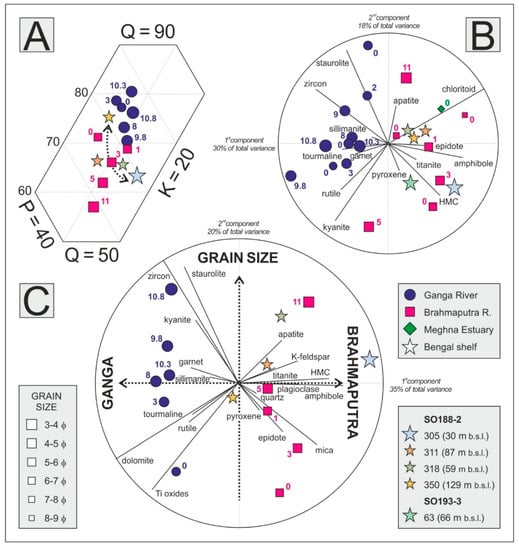Detrital modes of Bengal shelf silt compared with Ganga and Brahmaputra suspended load (size of symbols proportional to sample grain size; depth of sampling within the river channel in meters indicated close to each symbol; data after Garzanti et al. []. Bengal shelf sediments display Brahmaputra signature, although the most distal and finest grained sample is more akin to the Ganga. (A) Ganga silt is distinguished by higher quartz/feldspar (Q/F) and lower plagioclase/feldspar (P/F) ratios than Brahmaputra silt (arrow indicates proximal/distal trend; QPK plot after Dickinson []). (B) The biplot [] based on heavy-mineral data highlights the close affinity between heavy-mineral suites in Bengal Shelf silt and suspended load in the Brahmaputra River and Meghna estuary. (C) The biplot based on the entire mineralogical dataset (both LM and HM fractions) best highlights the different signatures of Ganga and Brahmaputra suspended load (first principal component, PC1) and the grain-size effect (PC2). Because of the presence of allochemical carbonate in shelf sediments, calcite grains were not included in the biplot.