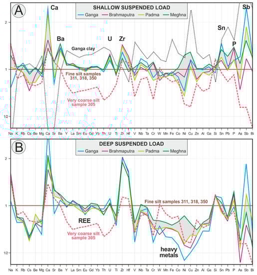 Geochemistry of Ganga, Brahmaputra, Padma, and Meghna suspended load entrained at shallow (≤2 m) and greater (>5 m) channel depth compared with Bengal shelf silt (elements arranged following the periodic table group by group; data normalized to the mean composition of fine silt samples 311, 318, and 350; Table S4, Supplementary Materials). (A) The composition of fine Bengal shelf silt compares broadly with shallow suspended load in the Padma River and Meghna estuary (gray field), in turn chiefly derived from the Ganga and Brahmaputra, but with notably less Ca, Ba, U, Zr, Sn, P, and Sb. Note that the composition of very coarse Bengal shelf silt (sample 305) is a quasi-perfect mirror image of that of Ganga clay (<2 μm; own data), which allows us to see fine Bengal shelf silt as a mixture of these two end members in subequal proportions. (B) The composition of very coarse Bengal shelf silt compares rather well with deep suspended load in the Padma River and Meghna estuary (gray field), even though with lower concentration of elements preferentially hosted in ultradense minerals (REE, Zr, Hf).