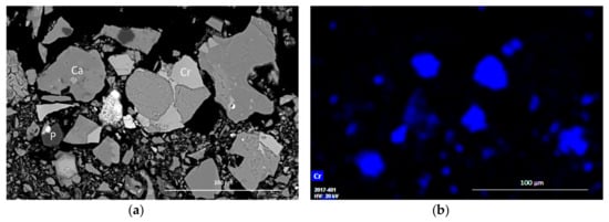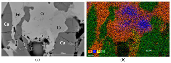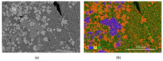 SEM-BSE image of CS slags. Ca = Ca(Al) silicates (larnite, gehlenite), Fe = Fe oxides (wustite, Fe spinel), Cr = Mg chromite. (a) BSE image of Fe-rich spinel with Cr-rich spinel inclusions in the matrix of Ca(Al) silicates. (b) Element distribution determined by EDX.