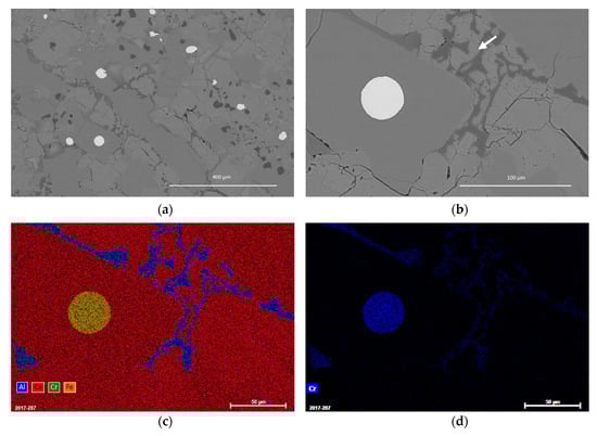SEM-EDX analysis of the SS samples shows that the matrix consists of CaMg silicates (merwinite, bredigite), Ca silicates (larnite, cuspidine), and CaMgAl silicates (akermanite) (Figure 6 combined with Table 2). Overall, the material contains many very fine particles, but also some composite grains. Small metallic stainless steel particles are present, which are mostly <5 µm in size. Chromium is present within these metallic particles, and also in distinct magnesiochromite spinel phases (10–30 µm).