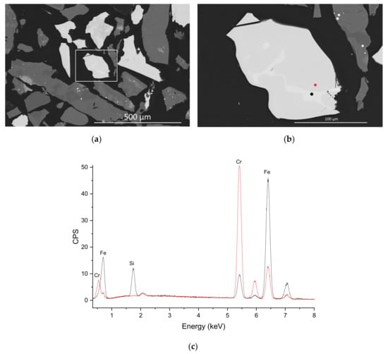 SEM-BSE image of HC FeCr slags. (a) Dark grey silicate slag particles and light-colored FeCr metal particles grains. (b) Detail of FeCr metal grain, with indication of EDX measurement locations (colored circles). Darker areas in the metal particle contain more chromium, as shown by EDX measurements in (c).