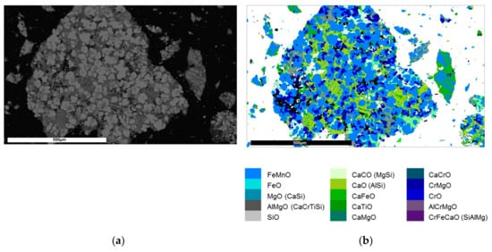 Apart from providing a different level of information, results from one method can also be used to clarify results from the other. For example, EDX spectra combined with XRD results and expertise on mineral morphology were used to identify the mineral phases observed in SEM. Backcalculation of the chemical composition (from wet chemistry) was needed to verify the XRD results. The uneven distribution of Cr within the Cr-rich phases (see e.g., Figure 2), observed by SEM, explains the peak shift and overlapping characteristics of the respective phases in the XRD patterns. This gradually changing chemical composition within single phases also hampers the correct quantification of the Cr content in MLA, as it would require the inclusion of a large number of phases to the mineral list (each for one possible composition in the solid solution). A verification of the MLA data of slags with those restrictions falls out of the scope of this study.