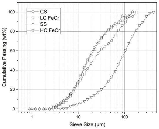 Particle size distribution of the Cr-containing grains in the slags as determined by MLA. It can be seen clearly that the Cr-containing phases of the CS, LC, and SS slags show a similar distribution, whereas the grains of the HC are much larger.