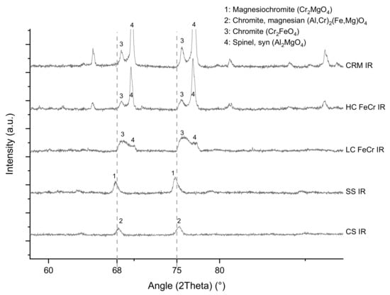 The XRD analyses showed that the IRs consist of spinels (Figure 9). From the different peak positions of spinels, as illustrated in Figure 9, it is clear that the spinel composition differs between the materials, in accordance with the spinels identified in the original bulk samples. For the HC FeCr, two types of spinels are present, the most predominant being a Cr-free spinel (spinel, (Al2MgO4)) with a smaller fraction of chromite (Cr2FeO4). The peak pattern of the reference material SARM 77 is quite identical, as expected, since this is the same type of material. For the LC FeCr, broad peaks are present, indicating that both spinel types occur (but with lower contribution of the Cr-free spinel) as well as different compositions in between. For the SS slags, magnesiochromite is identified, whereas in the CS, an intermediate composition of (Al,Cr)2(Fe, Mg)O4 is found.
