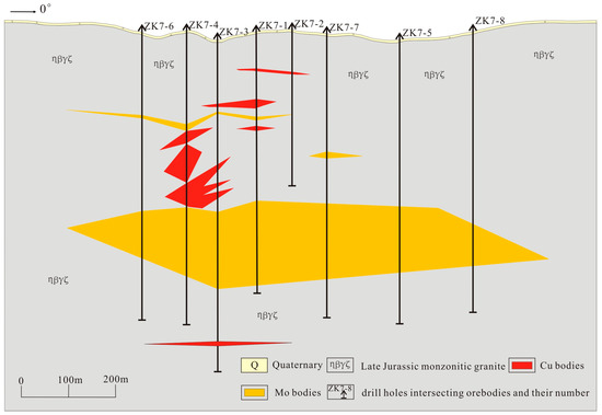 Geological cross-section of Line No. 7 through the Chang’anbu Cu–Mo ore deposit (modified after [8]).