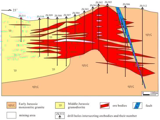 Geological cross-section of Line No. 0 through the Fu’anbu Mo ore deposit (modified after [11]).