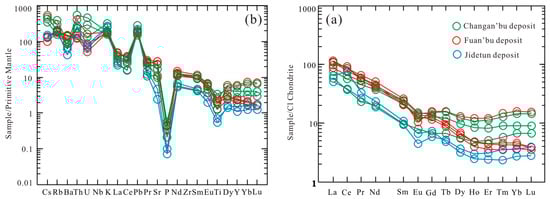 Primitive-mantle-normalized multi-element and chondrite-normalized rare earth element (REE) patterns for ore-hosting rocks from the Chang’anbu, Fu’anbu, and Jidetun deposits. (a) primitive-mantle-normalized multi-element patterns for ore-hosting rocks; (b) chondrite-normalized rare earth element (REE) patterns for ore-hosting rocks.