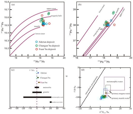 Pb and S source diagram for sulphides. δD versus δ18OH2O discrimination diagram for fluids from the Chang’anbu, Fu’anbu, and Jidetun deposits [34,35,36]. (a) 206Pb/204Pb-207Pb/204Pb; (b) 206Pb/204Pb-208Pb/204Pb; (c) δ34S content discrimination; (d) δ18OH2O-δD.
